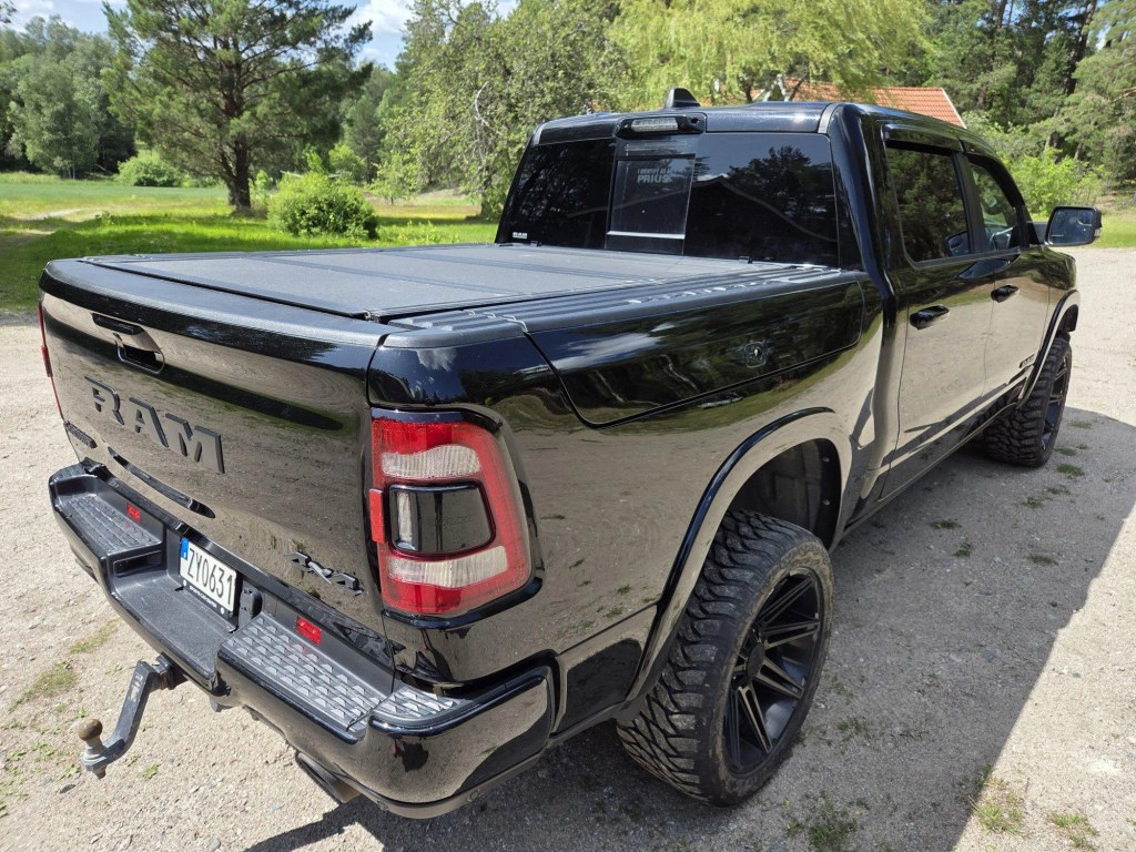 Exteriör: Aggrssion och pondus i varje detalj RAM 1500 ser ut som den äter mindre bilar till frukost. Den massiva fronten med sin RAM-grill, den upphöjda motorhuven med funktionella luftintag och de grova däcken ger den en närvaro som är svår att ignorera. Vårt exemplar är helsvart med tonade rutor, svartlackerade fälgar och offroad-däck – det här är mer än bara transport, det är ett fordon med attityd.