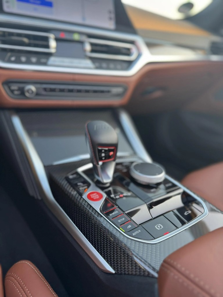 Öppnar du dörren möts du av en kabin som blandar sportighet med komfort på BMW-vis. Stolarna – M Sportsäten i brunt Merino-läder – ger både visuell njutning och fysiskt stöd. Man sitter lågt, tight och med perfekt grepp om den greppiga M-ratten med röda M-lägen. Interiören i just vårt testexemplar kändes varken kall eller överdesignad, utan perfekt avvägd mellan funktion och lyx. Karboninläggen, den digitala instrumenteringen, head-up displayen och de detaljerade sömmarna visade att BMW vet precis hur de ska bygga en cockpitskänsla som känns förarcentrerad – utan att bli överväldigande. När vinden sveper in över axlarna vid 80 km/h, är det ändå värmen från sätena och det fysiska kvalitetsintrycket som dröjer sig kvar.